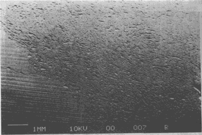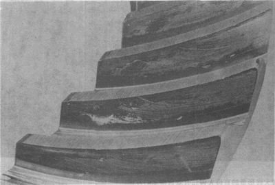 表面硬化弧齒錐齒輪大輪工作齒面的表層壓碎。在輪齒上可看到大量的與小齒輪齒面接觸線方向一致的裂紋。一齒面上有大量材料脫落,形成一大的凹坑。 |