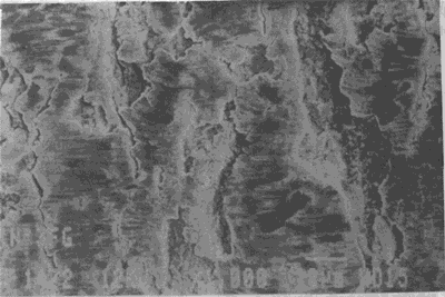 油膜相對(duì)于重載很薄的潤滑條件下運(yùn)轉(zhuǎn)的齒輪副工作齒面的損傷。損傷面放大后可見密密麻麻成片的微小蝕微小裂紋。