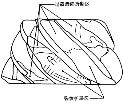 這類折斷通常只在一次或很少幾次嚴重過載時發(fā)生。有時,由于過載產(chǎn)生的初始裂紋會像疲勞裂紋一樣緩慢發(fā)展后而折斷,這種初始裂紋區(qū)域在裂紋發(fā)展中通常還存在有微動腐蝕的跡象。過載斷口面有三種類型: