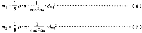 在設計階級,精確確定小、大錐齒輪的當量質(zhì)量m1及m2是困難的。對常見的錐齒輪結(jié)構?山频匾詣恿Ξ斄繄A柱齒輪(見圖2)質(zhì)量來代替。于是,m1和m2可按公式(6)、(7)計算。