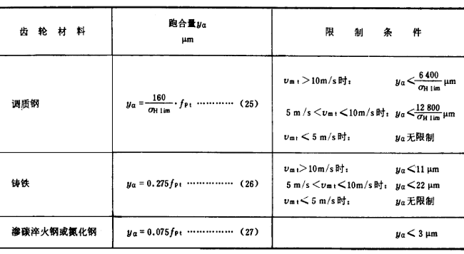 跑合量yα定義為通過跑合使運轉(zhuǎn)之初的嚙合齒距誤差減小的量。如無實測數(shù)據(jù)時,可由表7各式計算或由圖3、圖4查取。