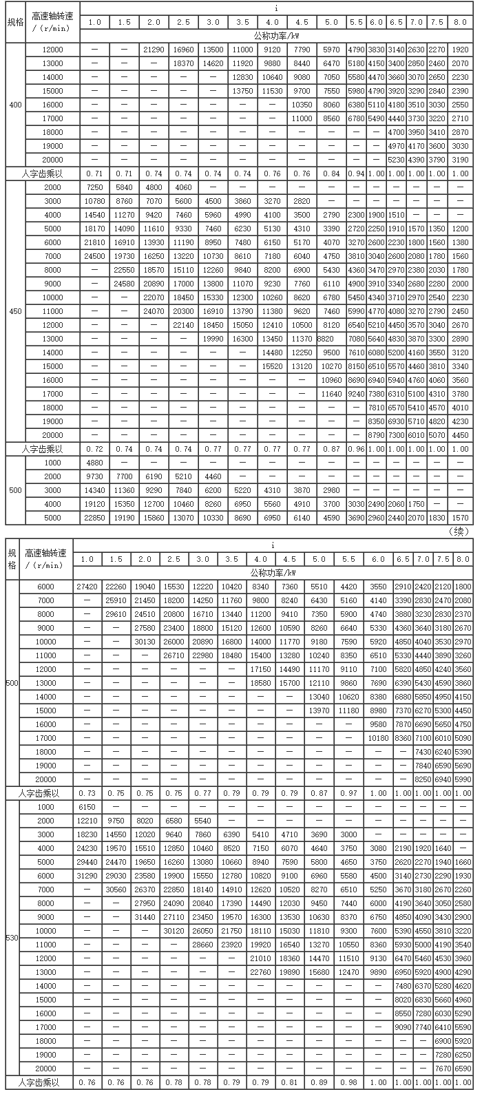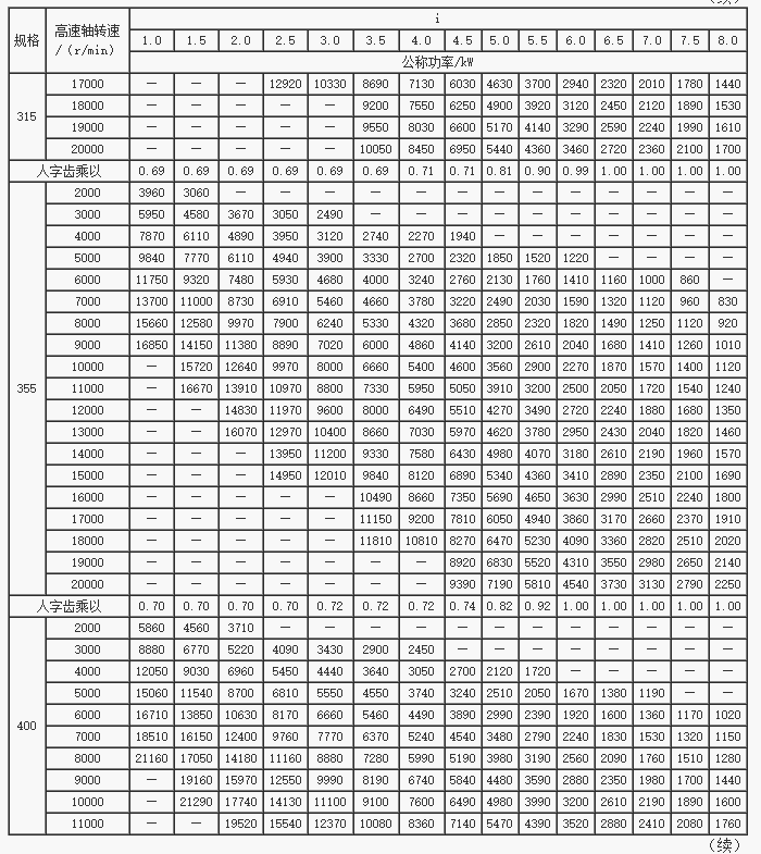 GS系列高速漸開線圓柱齒輪箱公稱功率(二)(JB/T7514-94)