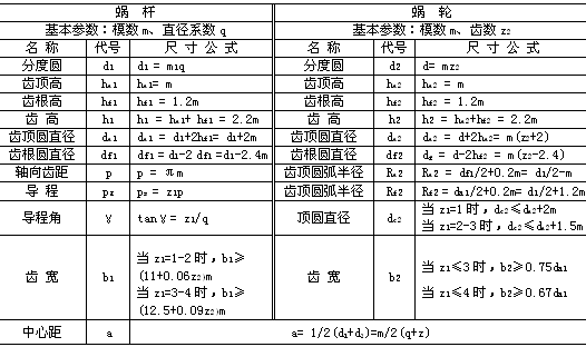 蝸桿蝸輪的主要參數(shù)有:模數(shù)m、蝸桿分度圓直徑d、導(dǎo)程角γ、、中心距a、蝸桿頭數(shù)z1、蝸輪齒數(shù)z2等,根據(jù)上述參數(shù)可決定蝸桿與蝸輪的基本尺寸,其中z1、z2由傳動要求選定。幾何尺寸計算如下表所示。