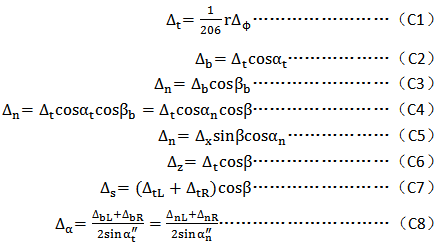 C2齒輪各項誤差應(yīng)按下述規(guī)定的方向計值:Δfpb、ΔFb、ΔFpX、Δffβ、ΔFw、ΔEwm、jn在齒面法線方向計值;ΔFi′、Δfi′、ΔFp、ΔFpk、Δfpt、ΔFβ、ΔFic′、Δfic′、jt在分度圓切線方向計值;Δff在基圓切線方向計值;ΔFr、ΔFi″、Δfi″、ΔEα″和ΔEH在雙側(cè)齒面徑向計值;ΔEs在雙側(cè)齒面分度圓螺旋線的法線方向計值。