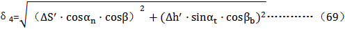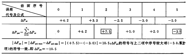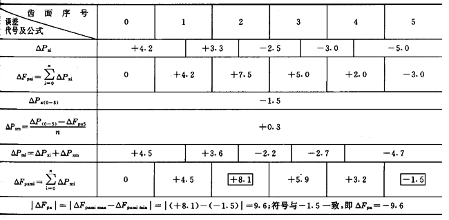 13.2.2測(cè)量?jī)x器的檢定 儀器應(yīng)按檢定規(guī)程或其他有關(guān)技術(shù)文件的規(guī)定進(jìn)行檢定,經(jīng)法定部門檢定合格后方準(zhǔn)使用。 13.2.3測(cè)量?jī)x器的校準(zhǔn) 比較法測(cè)量前、后應(yīng)用量塊和專用檢具校準(zhǔn)儀器。 13.2.4測(cè)量基準(zhǔn)的確定 見附錄B(補(bǔ)充件)。 13.2.5測(cè)量位置的確定 軸向齒距偏差應(yīng)在齒高中部對(duì)圓周均布的不少于四個(gè)位置的左、右側(cè)齒面沿軸向逐齒進(jìn)行測(cè)量。單側(cè)齒面工作的齒輪,只測(cè)工作側(cè)齒面。 采用比較法測(cè)量時(shí),應(yīng)逐個(gè)測(cè)量各單個(gè)軸向齒距偏差,對(duì)于5級(jí)和高于5級(jí)精度的齒輪應(yīng)加測(cè)跨距最大的軸向齒距偏差。 采用絕對(duì)法測(cè)量時(shí),應(yīng)以工作齒寬內(nèi)最靠某端的齒為起始位置依次沿軸向逐齒測(cè)量對(duì)該齒的軸向齒距偏差。 13.2.6測(cè)量的不確定度 軸向齒距測(cè)量的不確定度UFpx不應(yīng)大于被測(cè)齒輪軸向齒距極限偏差的三分之一,使用手提式儀器測(cè)量時(shí),不應(yīng)大于五分之一。 當(dāng)不能確定測(cè)量不確定度是否能滿足上述要求時(shí),應(yīng)時(shí)行測(cè)量不確定度的計(jì)算。 UFpx(μm)按下式計(jì)算 式中:δ1——儀器的示值誤差[見附錄A(補(bǔ)充件)也允許按儀器檢定規(guī)程確定],μm; 比較法測(cè)量時(shí),δ1為儀器的示值變動(dòng)性,μm。 δ2——傳感器的示值誤差,μm; 絕對(duì)法測(cè)量時(shí),此誤差已包括在δ1中,此時(shí)δ2=0。 δ3——被測(cè)齒輪與量塊(或測(cè)量系統(tǒng)標(biāo)準(zhǔn)尺)溫度不一致產(chǎn)生的測(cè)量誤差,μm; δ3=Lx[α(t-20)- αo(to-20)]sinβb·1000…………………………(68) 式中:Lx——被測(cè)兩個(gè)同側(cè)齒面的公稱軸向齒距,mm。 δ4——雙測(cè)頭的連心線或單測(cè)頭的移動(dòng)方向與軸心線不平行產(chǎn)生的測(cè)量誤差,μm; 式中:△S′——在切向平面內(nèi)的平行度誤差,μm; △h′——在徑向平面內(nèi)的平行度誤差,μm。 13.3測(cè)量結(jié)果的處理 ΔFpx的測(cè)量結(jié)果可用直接法直接在指示表上讀出,也可在用間接法測(cè)得的全齒寬整體誤差曲線上取值(詳見16.3.3.4)。 ΔFpx應(yīng)在齒面法線方向計(jì)值(μm),以其它方向測(cè)量時(shí),應(yīng)對(duì)測(cè)量結(jié)果進(jìn)行換算(見附錄C)。 以在13.2.5所規(guī)定的各測(cè)量位置中測(cè)得的絕對(duì)值最大的軸向齒距偏差作為測(cè)量結(jié)果。 13.3.1比較法測(cè)量結(jié)果的處理 由指示表讀出的逐齒軸向齒距偏差ΔPxi經(jīng)計(jì)算得到ΔFPX(見表13)。 表13逐齒測(cè)量數(shù)據(jù)處理 ΔFPXi——第i齒面相對(duì)0號(hào)齒面的軸向齒距累積偏差。 當(dāng)加測(cè)跨齒距最大的軸向齒距偏差ΔPx(0-5)時(shí),可用測(cè)得的ΔPx(0-5)對(duì)表13列誤差值進(jìn)行修正,按表14的計(jì)算順序算出較精確的ΔFPX。 表14跨齒修正法數(shù)據(jù)處理 ΔPxm——軸向齒距偏差修正量; ΔPmi——修正后逐齒單軸向齒距偏差; ΔFpxmi——修正后第i齒相對(duì)于0齒面的軸向齒距偏差。 13.3.2絕對(duì)法測(cè)量結(jié)果的處理 用單測(cè)頭在軸向上第一個(gè)齒面對(duì)零,逐齒測(cè)出各齒面相對(duì)于第一齒面的軸向齒距偏差,所測(cè)昨的各齒軸向齒距偏差中最大偏差和最小偏差之差值即為ΔFpxo |