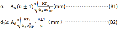 附錄B 齒輪的設計公式 (參考件) B1齒面接觸強度的設計公式 在初步設計齒輪時,根據(jù)齒面接觸強度,可按下列公式之一估算齒輪傳動的尺寸: 對于鋼對鋼配對的齒輪副,常系數(shù)值Aa,Ab見表B1,對于非鋼對鋼配對的齒輪副,需將表B1中值乘以修正系數(shù),修正系數(shù)數(shù)列于表B2。 表B1鋼對鋼配對齒輪副的Aa、Ab值 螺旋角β | 0° | 8~15 | 25~35 | Aa | 483 | 476 | 447 | Ab | 766 | 756 | 709 |