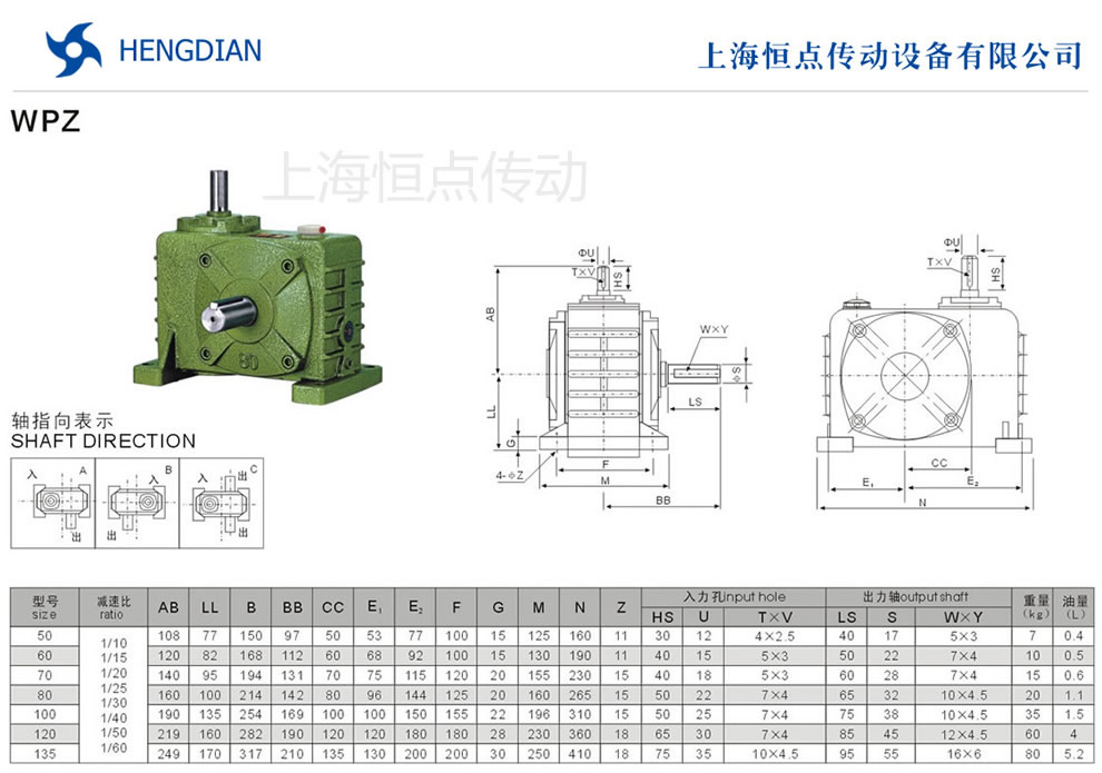 WPZ蝸輪蝸桿減速機(jī)的外形尺寸及安裝尺寸,WPZ減速機(jī)軸輸入,軸輸出.WPZ減速機(jī)軸指向表示方法.機(jī)座號(hào)從50到135,可選速比從10到60.WPZ系列蝸輪蝸桿減速機(jī)選型指南